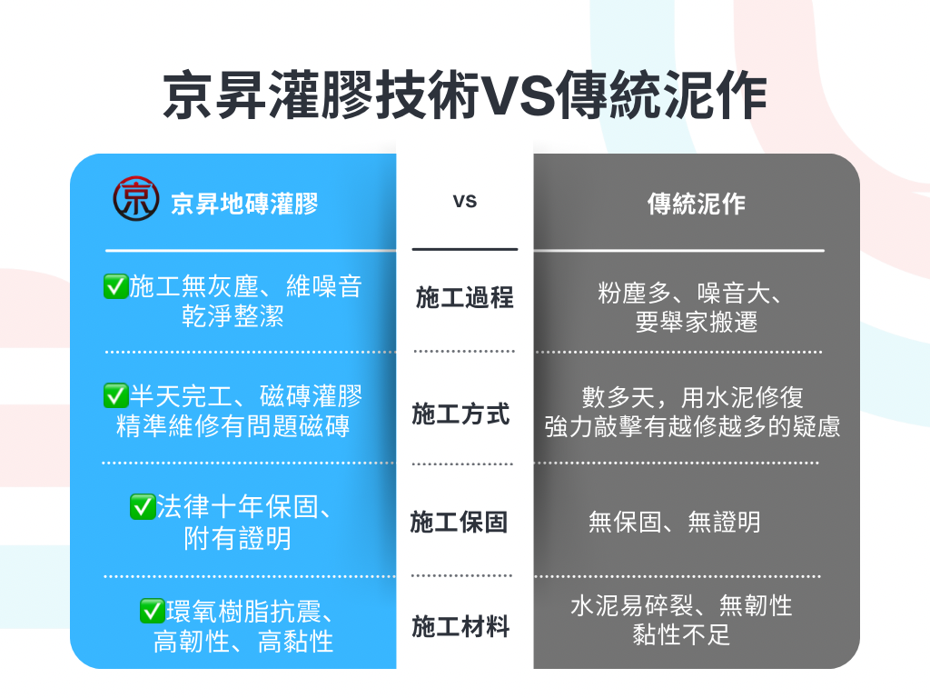 京昇採用環氧樹脂低壓灌注,不傷磁磚、無粉塵。確認磁磚灌滿後,檢查後無誤即可善後作業。